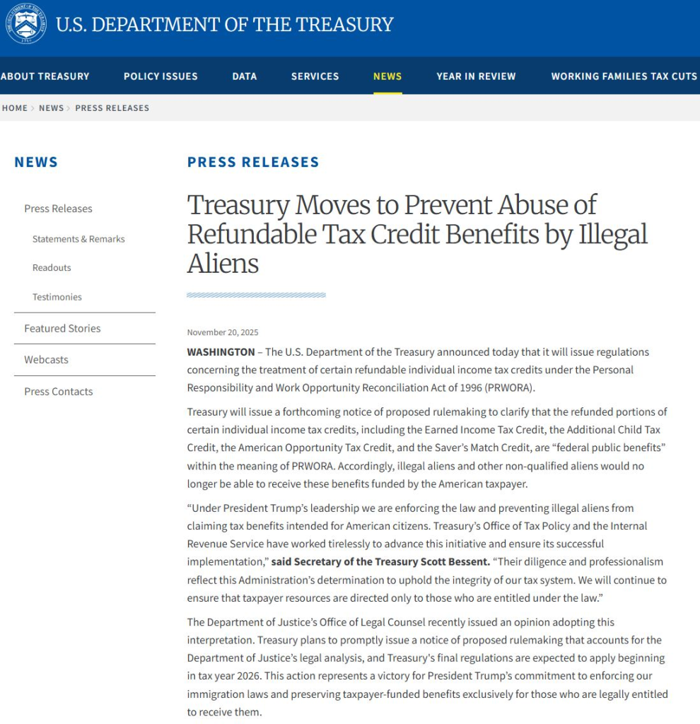 El Departamento del Tesoro toma medidas para prevenir el abuso de los beneficios de créditos fiscales reembolsables por parte de inmigrantes indocumentados 20 de noviembre de 2025 WASHINGTON – El Departamento del Tesoro de Estados Unidos anunció hoy que emitirá regulaciones sobre el tratamiento de ciertos créditos fiscales individuales reembolsables conforme a la Ley de Reconciliación de Responsabilidad Personal y Oportunidades Laborales de 1996 (PRWORA).